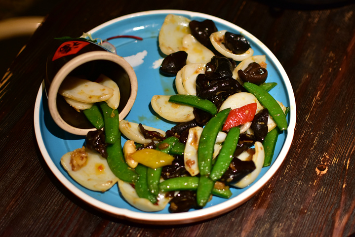 X0酱花枝片,好一盘多彩颜色的搭配!花枝片、荷兰豆、黑木耳混装在蓝色的盘子里,营养健康又爽口。