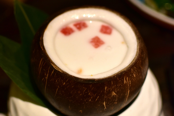椰奶清补凉,甜品要一个,平时椰子喝的多,这次来个椰奶补清凉,老椰子的椰汁更加香浓,经过处理,加入水果颗粒,更加富有风味。