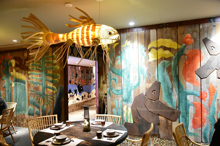 餐厅环境:首先,餐厅的环境很有氛围,温馨又有创意,实木木板贴墙,上面有一些海底世界的卡通手绘,这里最有创意的是吊灯了, 餐厅里安装了多个大大的金鱼吊灯,把餐厅的每一个角落都填满了暖暖的灯光,做旧的木圆桌,竹编的椅子,和餐厅的整体色调非常搭配,坐在这里吃饭,感觉特别放松。