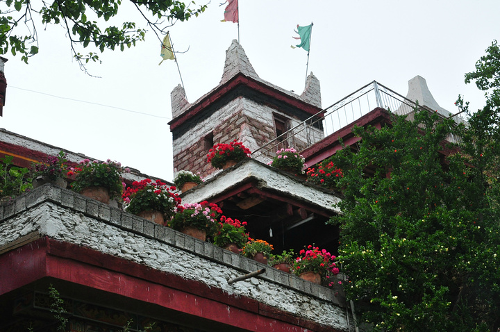 我们踏上藏寨高低不平的老石板路,狭窄曲折,曲径通幽,走几步就是断头路,径至藏寨人家,想入户了解了解民情,可大多关门闭户,我们只好看看民宅外观。藏寨民居的房屋很有特点,屋顶四角都高高矗起一个白色触角,不知有何意义。后来领队说是代表他们藏族不同的族别标志。