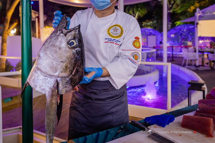 巨大鱼头旁,由厨师长现切三文鱼,当然你也可以要求跟厨师长和大鱼头合影留念。
