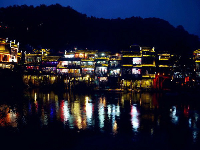 以120码的平均速度在高速公路上飞驰,夜幕降临,前后黑漆漆一片,偶尔一辆车从身边擦过,尾灯很快就淹没在深沉的雾色里。到达吉首,我们已经是饿得前胸贴后背,在去凤凰的路上,看到街边的烧烤摊,忙不迭地下来整上一碗炒米粉、数串烤肉和蛋炒饭,红红的小米辣让我们即刻体验了湘人重口味。