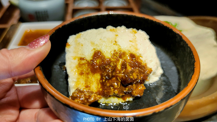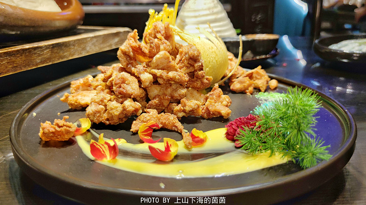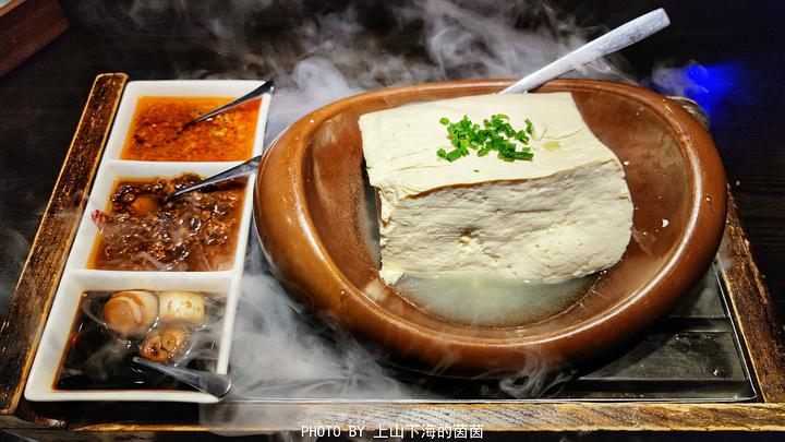 招牌豆腐(¥39):这是一道基本每桌必点的招牌菜,因为绝对仪式感满满!首先一整砖豆腐的体积超有诚意,而且干冰让整道菜仙气飘飘,颜值一百分!最重要的是这道“石磨豆腐”是严格按照传统工艺制作的,大豆原材料来自东北建三江农场有机大豆生产基地。白嫩、细软、味纯、入口即化、营养丰富,另有辣椒酱、蛋黄酱、香葱酱油三款不同的蘸料随心选,总有你一款迷倒你!