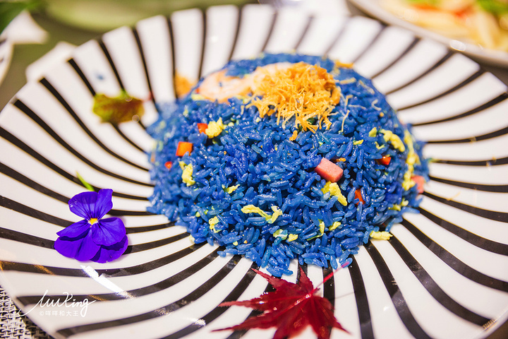 蓝色海洋炒饭:用蝶豆花的天然染色,蓝色米饭和虾仁的完美结合,鲜花做摆盘,很像一个精致的艺术品。