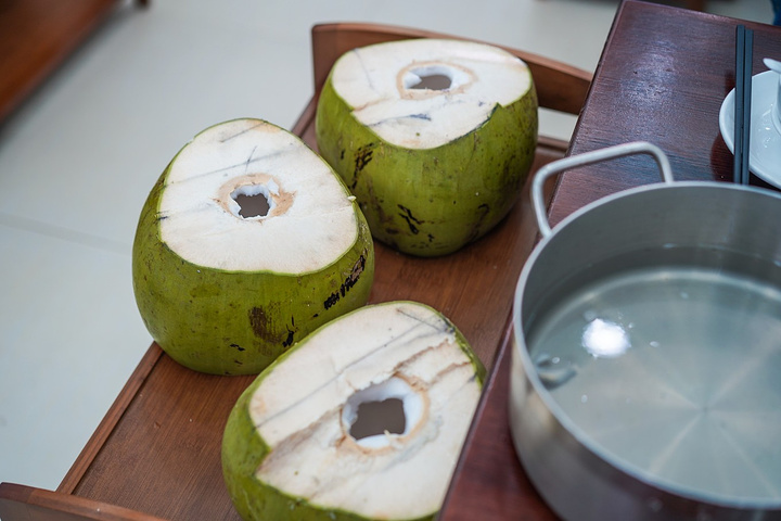 店家上菜很快,直接端了三个新鲜的大椰子上来,所谓三个椰子一锅汤,