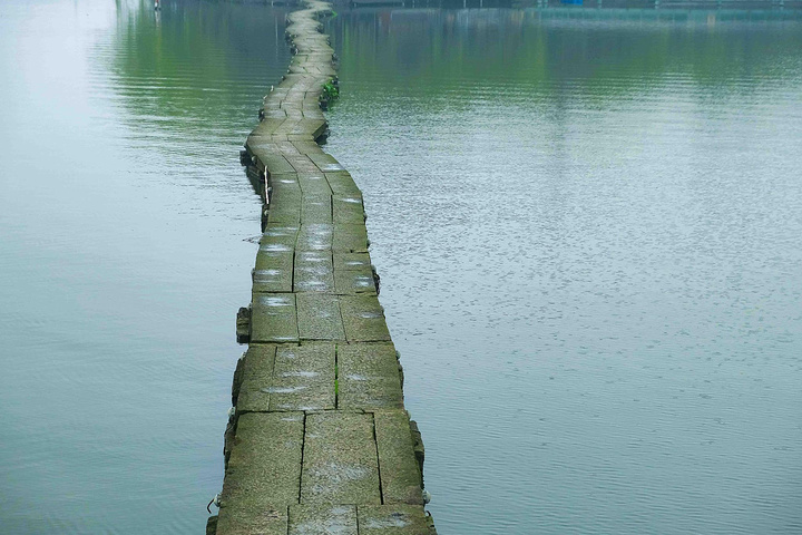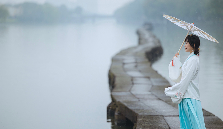 撑一把油纸伞,走在两面临水的古纤道上,寻着唐诗三百首的足迹,蜿蜒伸向水天极目之处,俨然一条飘带,诗情满千卷难,一绵湖风微拂素罗衫。