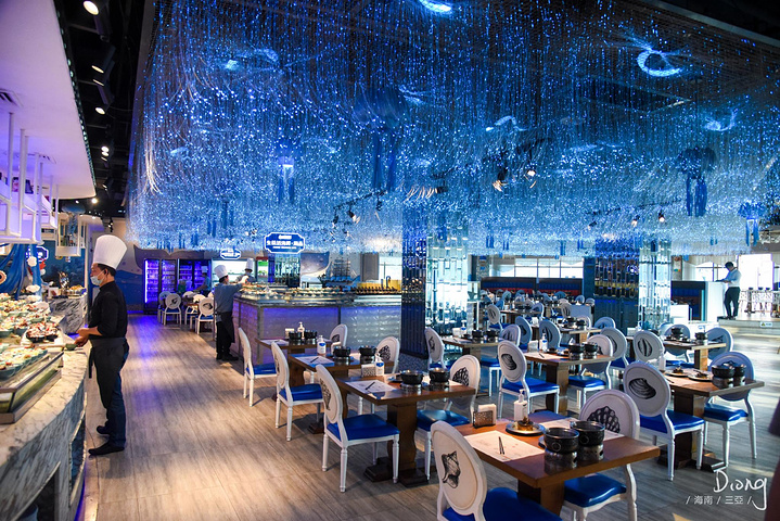 餐厅环境也很好,大厅有垂下来的灯幕,还有水母装饰轻轻摇曳,就像是梦幻海底,室外还有270度无死角看海露台,迎面就是大海的气息,想要坐室外海景位的话,一定要早点来。
