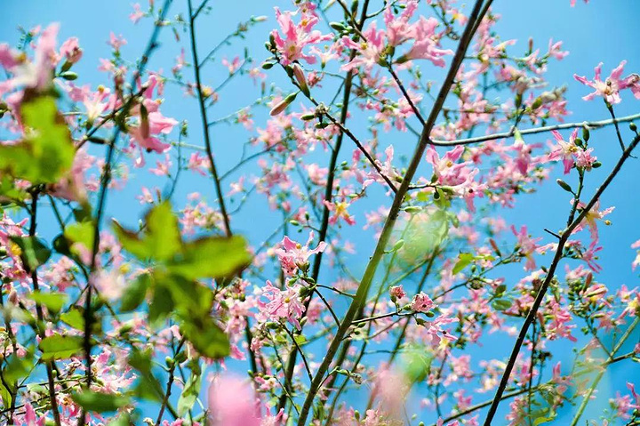 春天,如云霞一样的花处处堆积着,好像漂浮在天边的彩云落下,从没见过这样好看的颜色,在自然界染成一片。