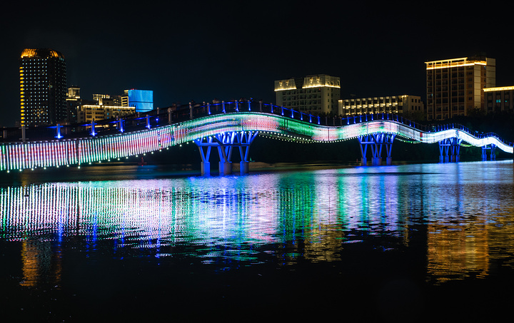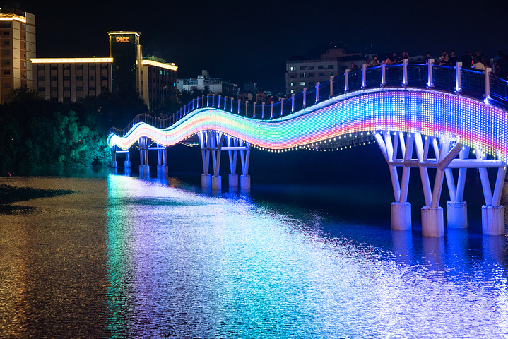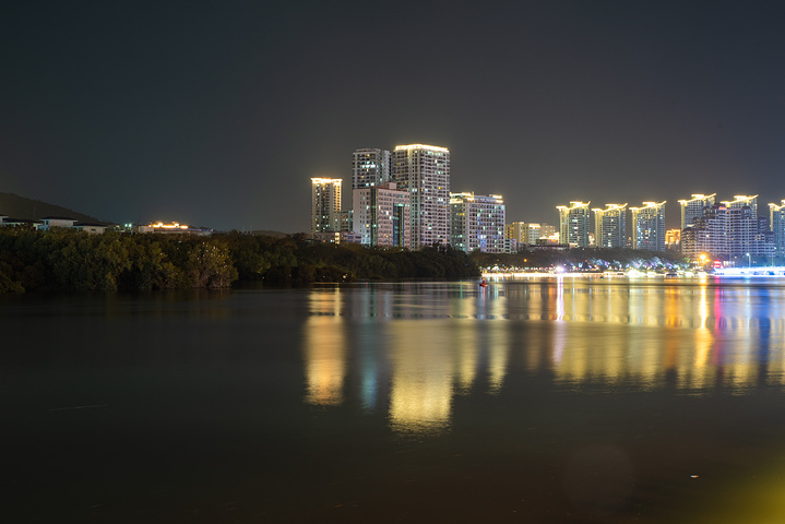因情人桥靠近第一市场,许多游客会去第一市场周边享用晚餐,我们这次也是选择在这旁边吃椰子鸡,刚好灯光亮起之时,晚餐享用完毕,顺便到这里来散散步,消消食,欣赏一下三亚河两岸的夜晚风光。它将四周建筑倒映,是那么的安静而祥和。