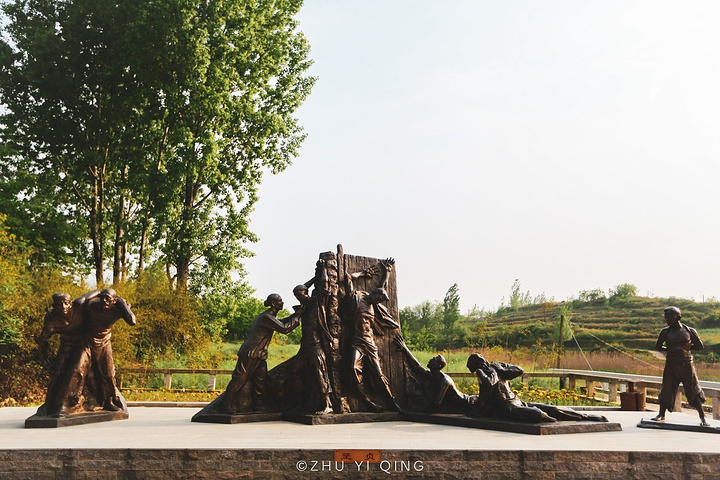 一块稻田旁边立着写着红田的石碑,另一侧是一组雕塑,展示红田惨案当时的事件,警醒人们勿忘历史。