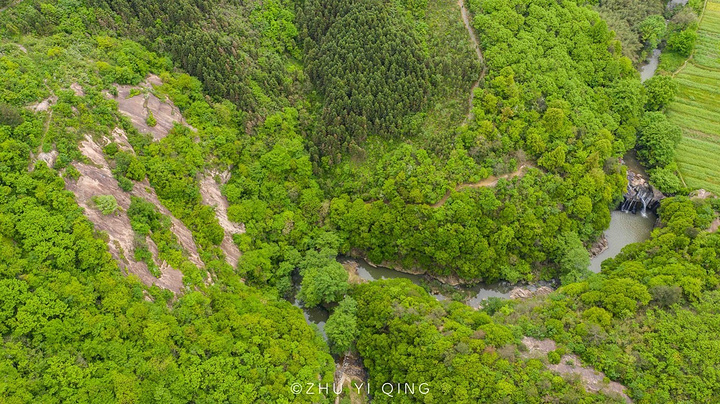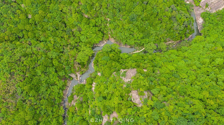 九女潭瀑布位于峡谷底部,瀑布的形状是火炬型的,东西长六十多米,南北宽度有四十米。无人机从高空拍摄到的瀑布,潭水沿着峡谷蜿蜒曲折地流动,给这一片绿色的峡谷增添了不少美感。不管是近距离欣赏潭水,还是从高空看,都会被大自然这瑰丽的景象所深深吸引。