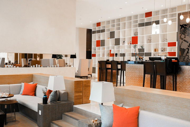踱步来到大堂吧映入眼帘的就是这个数字:北纬42. 因为酒店坐落于北纬41.47°,所以便成为了大堂吧的特殊符号。沉浸式的商务洽谈和聚会区域,采用轻现代的装饰格调,色彩靓丽。