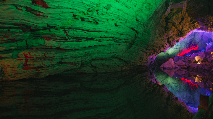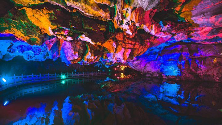 洞里最漂亮的莫过于那个倒影,干净透彻的水面平静舒缓,就像是一面镜子,把朦胧的灯光,姿态奇特的乳石一起倒映在水中,流光溢彩,美不胜收。