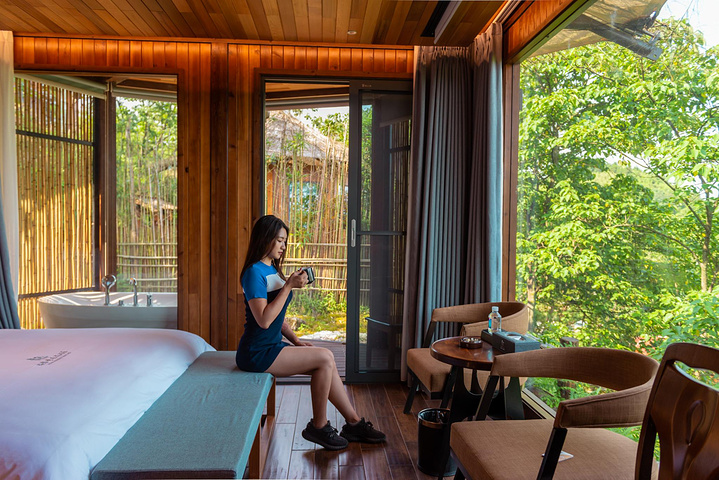 凯哥住的全景玻璃屋,超赞,躺在床上就可以看大桥,简直绝了。就是太阳晒着有些热,不过有空调问题不大,电动窗帘也是非常方便,按一下按钮自动开关,特别省心。
