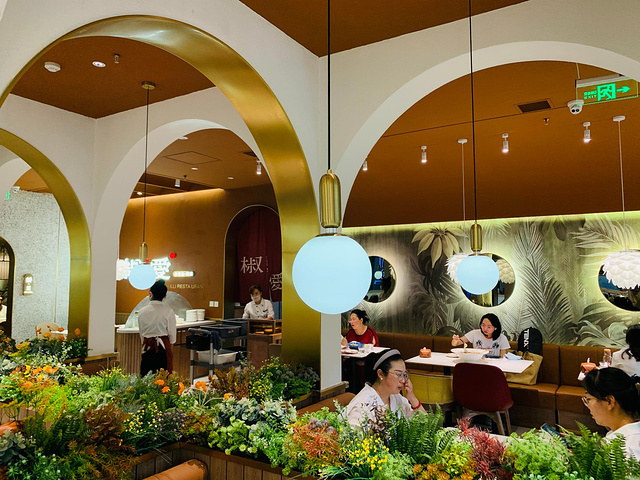 和平广场4楼的人气餐饮店,店内主打莫兰迪色调,一只只花瓣形状的灯球洒下的光彩照满了整张略带棕色调的餐桌,每一处都是入镜之选。