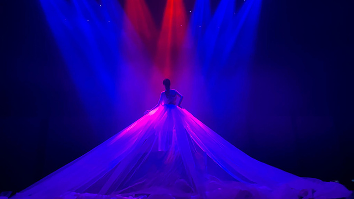 其次是笼罩公子和赤霞珠仙子的筒状软帛。生活中,往往会遇到情到深处无处躲的尴尬。在《贺兰山盛典》里,从天而降的筒状软帛,及时贴心地保护了公子和赤霞珠仙子的娇羞,观众像个“无耻”之徒,悦纳地坐在筒状软帛外面搓手的,掩面的。当顶天立地的筒状软帛突然自由下落的时候,独特的视觉艺术现象,分分钟呈现,分分钟消失。是瀑布,比瀑布流速更快;是秀发,比秀发落地更轻。