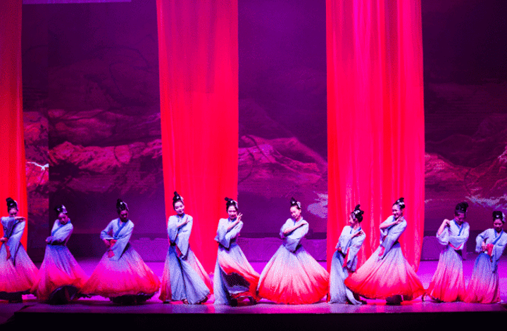 再次是五条顶天立地的红绸帛,依次急速从横杆上自由滑落。仿佛流动的红云,又仿佛蒸腾的红雾。叫人目不暇接,过目不忘。
