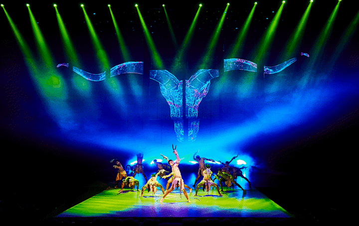 从来没有见过把升降舞台用到“跳崖”情节上的。在舞台最前面、最中央位置,有一方升降舞台,它把一缸水从下面运送上来,让赤霞珠仙子沉浸到水底,像鱼儿一样旋转吐泡,出人意料;它把一组舞蹈结束后的“造型”偷偷运送下去,神秘莫测;它让守护贺兰山的年轻壮士,大无畏地、视死如归地跳下悬崖,葬身深渊,令人震撼、痛心疾首,对为守护贺兰山的尊严,不惜付出生命代价的人们肃然起敬。