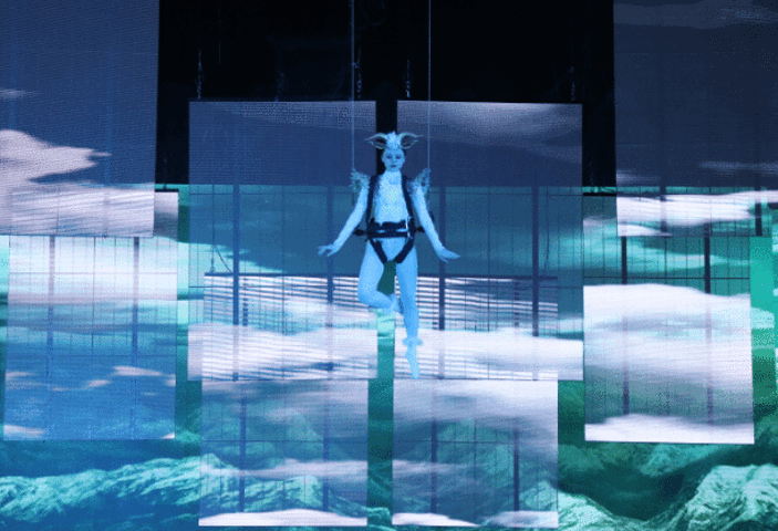一般情况下,观众会觉得只有杂技表演,才可以看到高空绳索辅助表演项目。然而,在《贺兰山盛典》里,同样可以欣赏到杂技一样的高空舞蹈表演。当岩羊精灵依仗着高空绳索,在人们头顶上空缓缓飘动,她微笑着向观众招手,投下善良和喜悦的表情。观众回应着岩羊精灵的问候,给她拍照,给她鼓掌,给她飞吻。