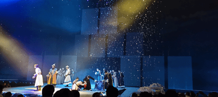 首先是开场前的软帛幕布。它像一朵巨大的吊金钟花,从剧场最顶端开放而下,花瓣上,祥云投影旋转出一阵水纹,又好像旋转出一阵云纹,这种似是而非的旋转,叫人思绪飘渺,不 明就里。当投影仪把“《贺兰山盛典》、编剧唐荣尧”的字幕打在软帛上时,观众会误以为《贺兰山盛典》是一部黑白电影,就在他们伸出脖颈“艰难的”辨析着那些令人惊艳的黑白字幕时,软帛幕布“嗖”地一声收缩走了,有一种梦境乍醒的惊恐,又有一种柳暗花明的惊喜。一个海市蜃楼般的舞台倏忽间呈现在观众面前。观者会感觉从黑白电影的年代转瞬切换到声光电的3D/5G大时代,十分穿越。