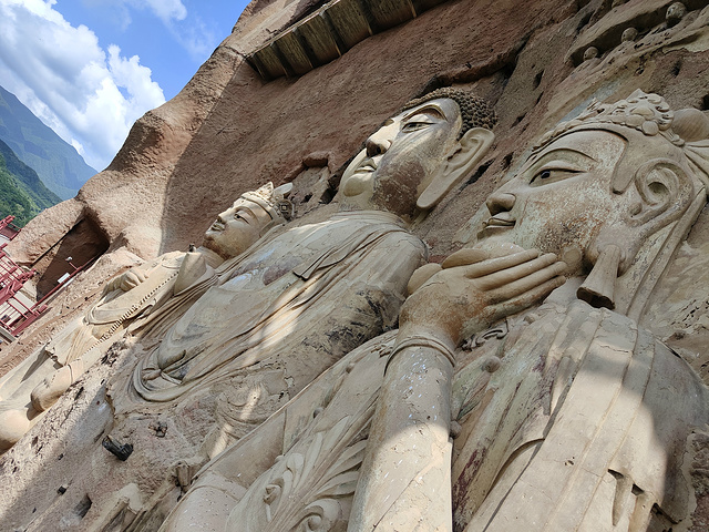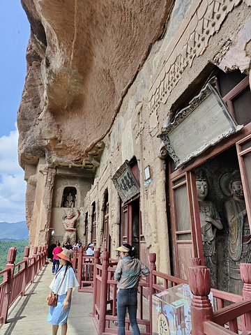岩壁上则修筑了一层层的悬空栈道,悬空栈道非常险要,最高处有六百多米,在栈道之间开凿了多座大大小小的洞窟和佛像,在山下拍照非常壮观。