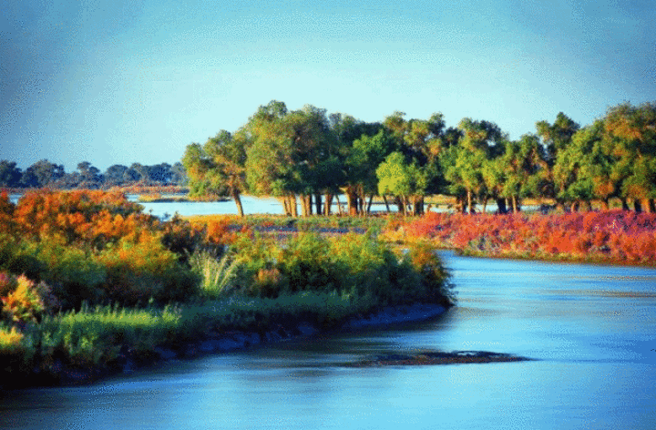在额济纳金黄色的土地上,缓缓流淌着黑河的身影,滋润着胡杨林,造就了大漠胡杨林的奇特美丽的景观。