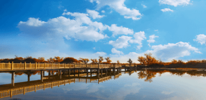 进入景区,最先映入眼帘的便是如意桥。长长的如意桥横跨于湖面之上,在蓝天白云的映射下,十分美丽。从如意桥走过,我们便可揭开大漠胡杨林的神秘面纱。