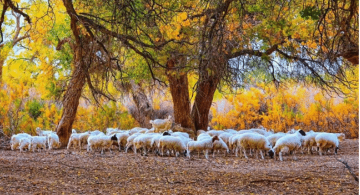大漠田园中有着无数古老粗壮、造型各异的胡杨林。除此之外,小胡杨、沙枣林及红柳篱笆零零散散分布其中,不时有羊群、牛群或骆驼漫步,给人们展现出生动的田园风采。