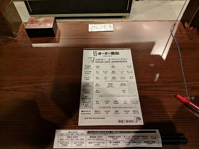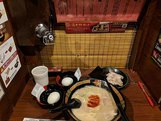 一下电车就找到了家一蘭拉面,点了一碗招牌的一蘭拉面+两个鸡蛋,承惠120RMB。一下飞机就大出血。这家店很小但是很精致,在门口的精算机自行投币点餐后出来一张小纸条[,然后你拿着这张小纸条去找一个卡座坐下把纸条递给帘子里的服务员就好了,帘子送餐后会关起来,无论你吃相多难看都不用担心。坐在里面吃很有安全感(感叹日本人想得真是周到)。需要服务按一下卡座里的铃就好啦。