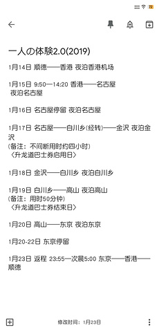 首先破出我本次的行程,有兴趣冬天去日本的朋友可以参考下我的行程,这个行程包括了冬天日本热门的地点,而且各个地方的距离也不是太远(除了高山到东京。高速巴士耗时5个小时)