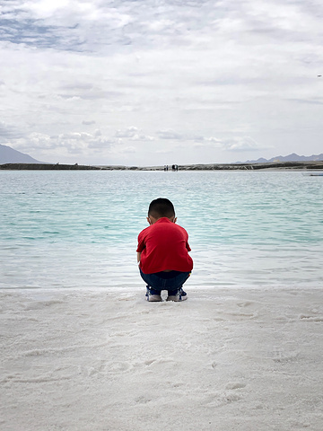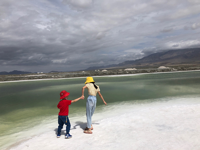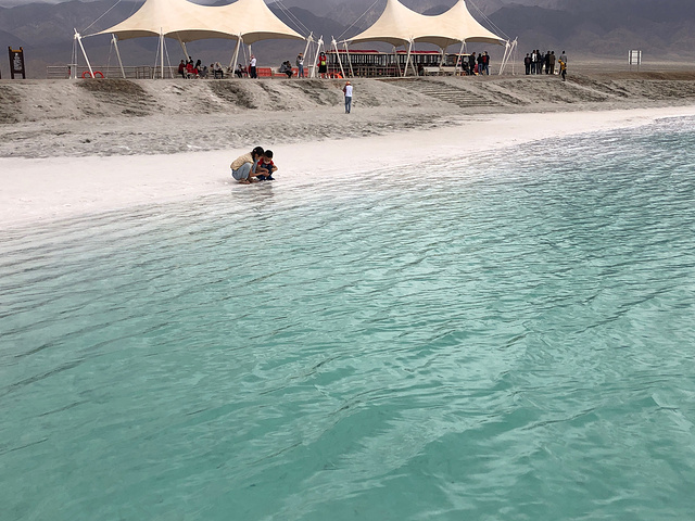 早起前往翡翠湖。和茶卡盐湖一样都是打造盐湖景致。但翡翠湖,更像镶嵌在盐湖上的翡翠。孩子们在湖边玩了很久。