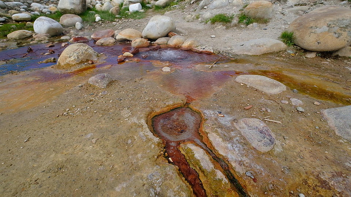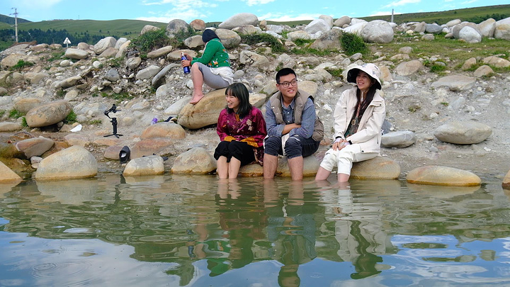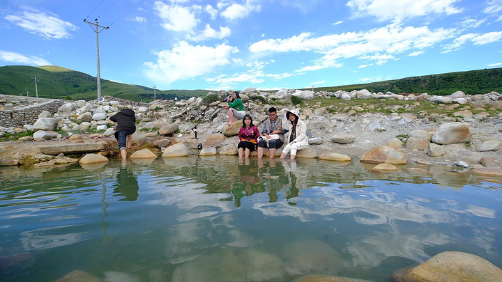 回到村子,我们去村口泡了野温泉,慰藉徒步过后疲劳的双脚。野温泉其实是几个小的水凼,水凼很小,只够泡脚,在蓝天白云的包裹中,就在神山的脚下。一边是滚烫的热水,一边是冰凉的冰川水,融合在一起便成了温度恰到好处的野温泉。