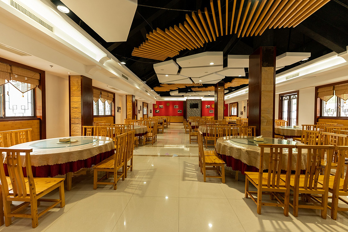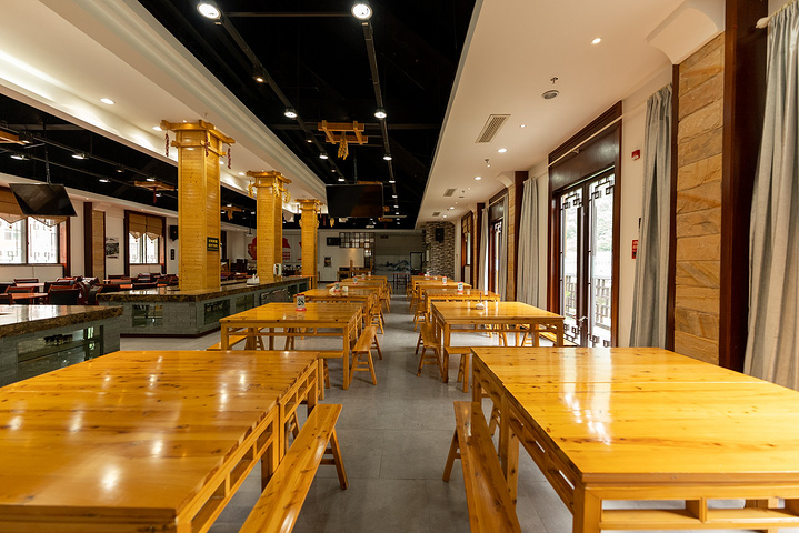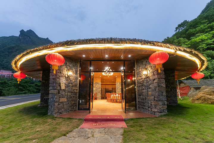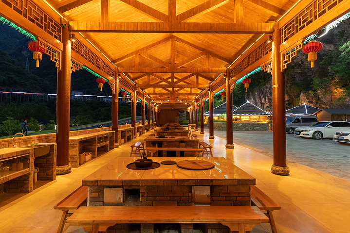 朝天吼还有独具特色的草堂餐厅,砖石垒砌的墙,用草做屋顶,有一种回归自然的感觉。长廊里的大锅灶,简单的食材飘香的味道,围坐一起享用更有气氛。