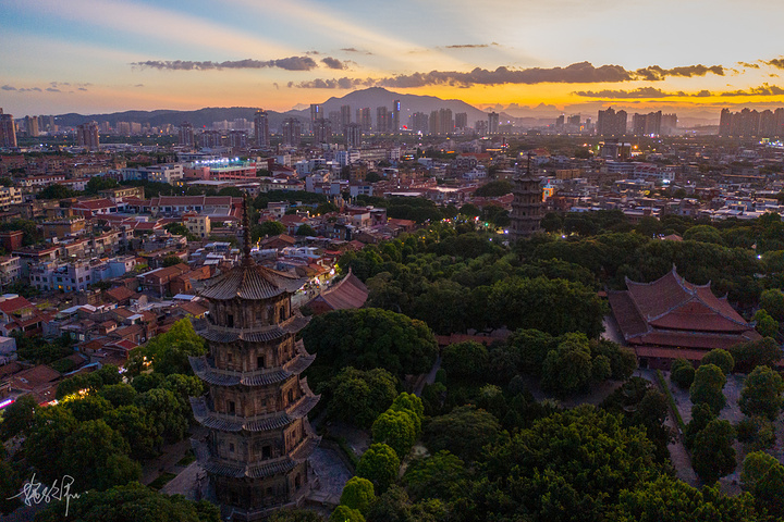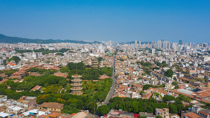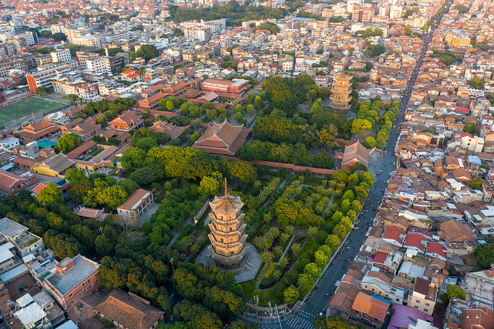 从前还不流行无人机的时候,常常想要各种爬楼从高处俯视泉州,看看老城区里的红砖红瓦。开元寺航拍起来是非常有气派的,建于唐代的开元寺是福建省内规模最大的佛教寺院,占地面积78000平方米,东西二塔再此屹立千年,泉州老城的建筑也没有高过东西塔的。