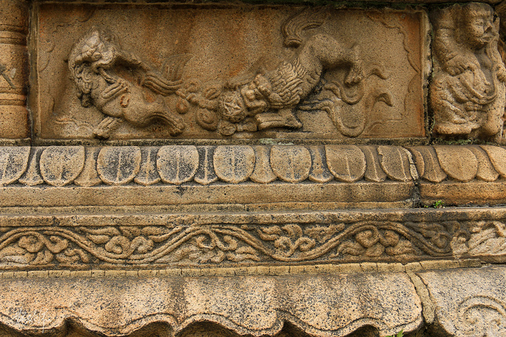远远看去东西塔像是木头,但实则全是花岗岩,是依照木头入榫的结构建造而成的,非常不容易的建造设计。东西塔上面的浮雕每一个都不一样,东塔象征的是婆娑世界,而西塔则是西方极乐世界。