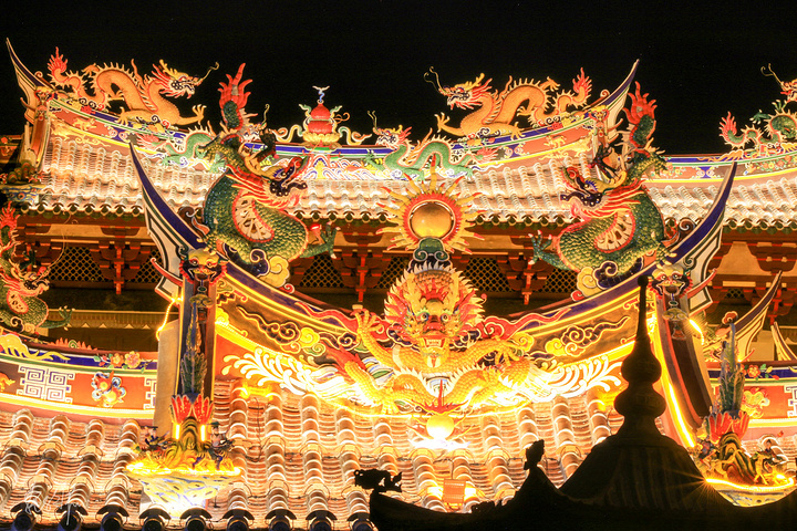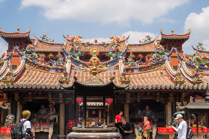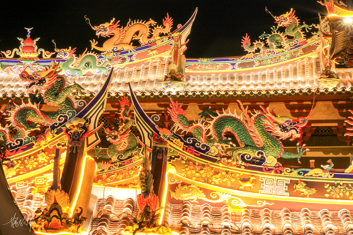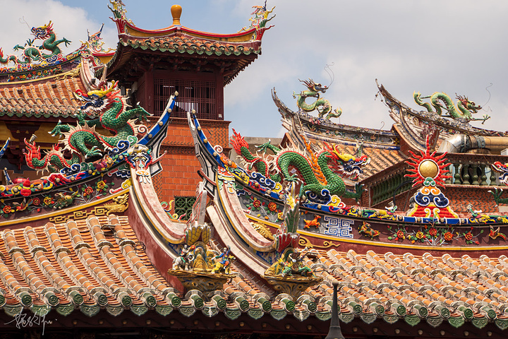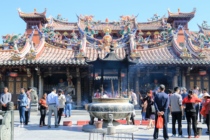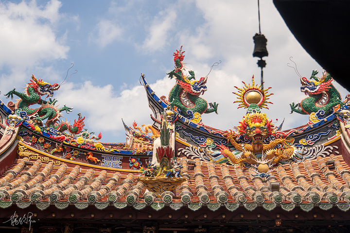 三座大殿并排在一起,形成宏伟壮观的庙宇建筑群,特别是关帝庙的屋脊,剪瓷龙雕,花鸟走兽,什么样的造型都有,十分闽南。