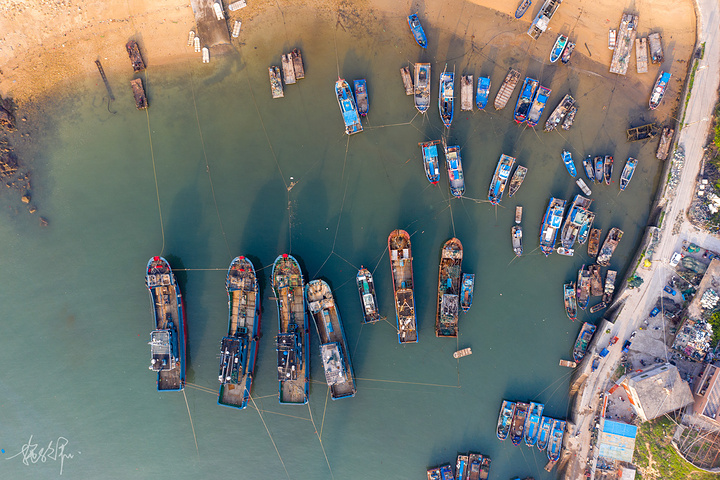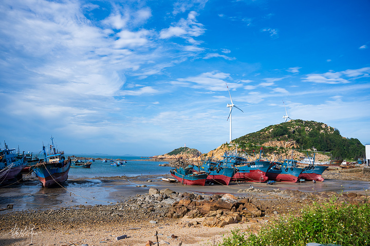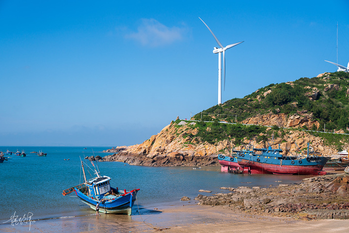 渔船散落在浅滩附近,深蓝色涂料在暴晒一天后,显出淡色的原本的样子来,船主人在甲板上收拾着渔网,不时传来闽南语的应和声。