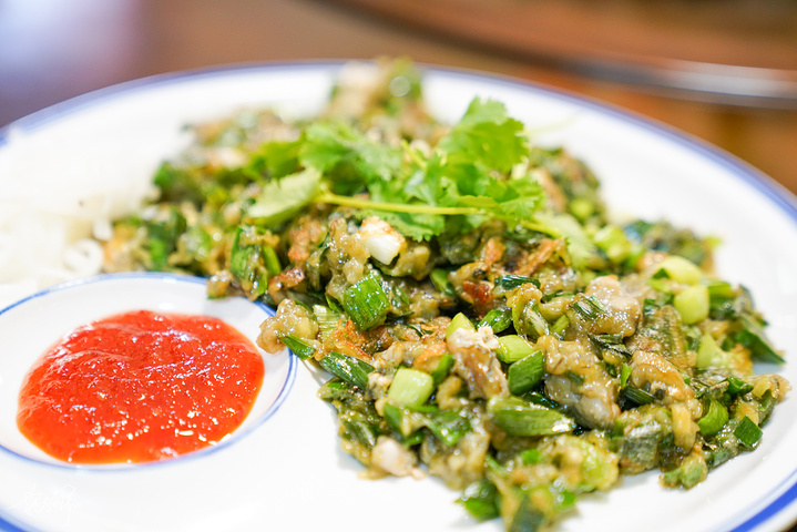 > 海蛎煎,海蛎加蒜苗拌地瓜粉,最后加入鸡蛋,完美。