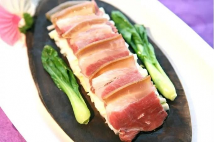 将腌咸肉切片,以腌笋打底放在樟木刀板上蒸熟,