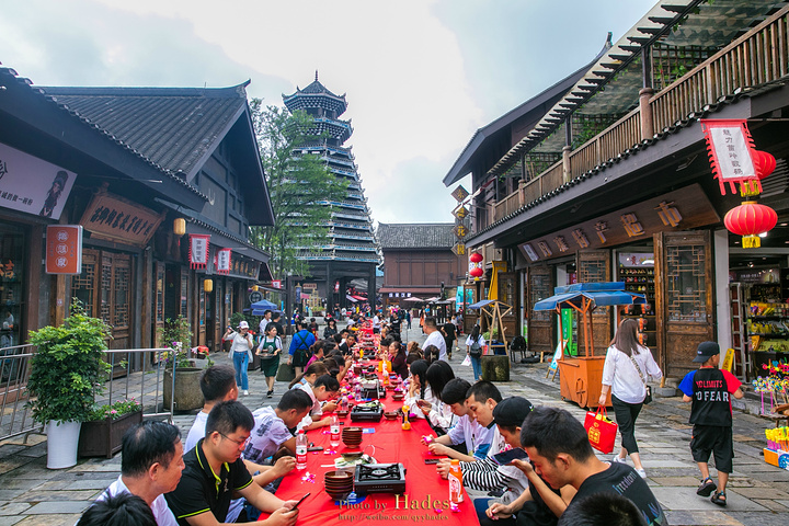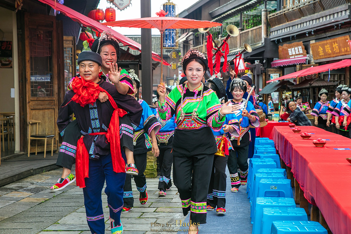 小镇在节庆的日子里,街道上还会摆起几百米长的长桌宴。大家沿桌而坐,共享当地特色美食,气氛超燃。运气好的话,还能遇到苗家婚礼,那氛围想不热烈都难!