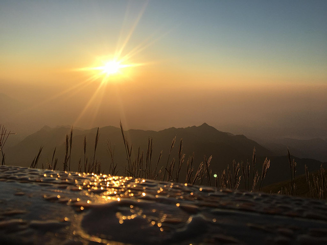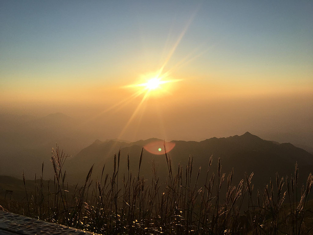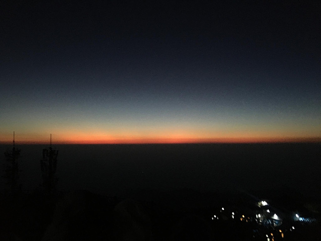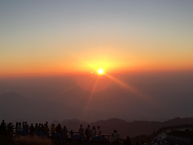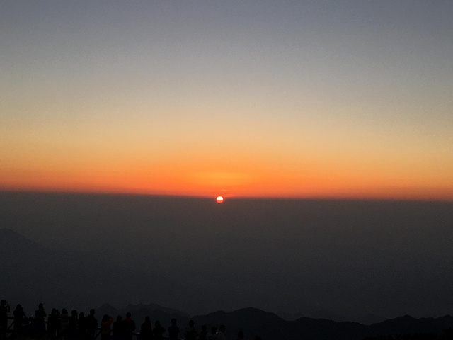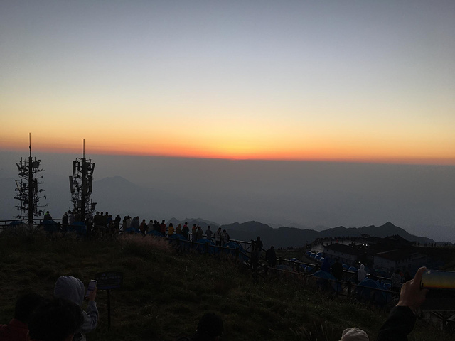 5点多人越来越多,有裹着睡袋来的,有穿短袖短裤过来的,有一家老少过来的,大家都是同一个目的:看日出。时间一点点推移,东方突然露出一点光亮,像在黑暗中用刀劈开一道口子,光亮一点点透过口子,变成一道越来越大的缝,充满希望的裂缝,越来越红,越来越亮,就像把希望洒在每个人脸上,困难和挫折都会过去。