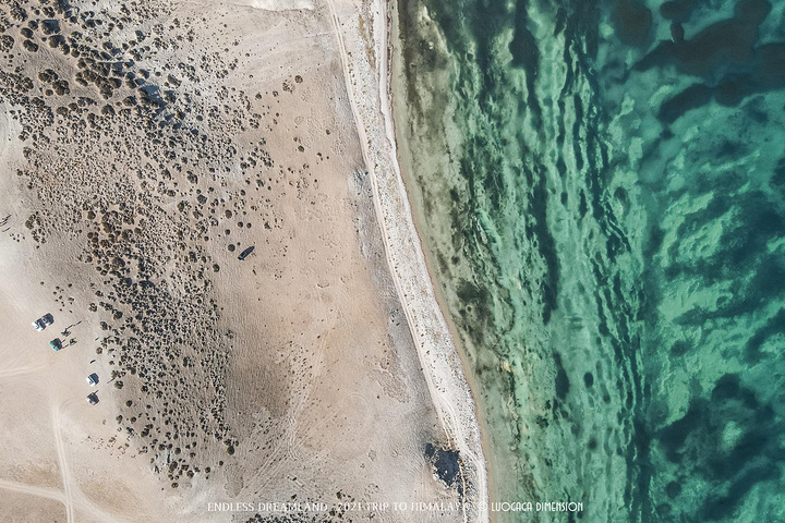 玛旁雍错隔壁是被称为“鬼湖”的拉昂错,藏语意为“有毒的黑湖”,与淡水的圣湖一路相隔,水微咸,人畜皆不能饮用,这大概是“鬼湖”之名的由来吧。网上有人为了制造神秘感,宣称鬼湖无风起浪,到达之前我还真信了,结果人家有风都没啥浪,一片祥和,我还神经兮兮的继续找鬼湖的诡秘之处,突然看见鬼湖上起了一层“白雾”,兴奋了一阵,还在猜测是不是有地热,结果后来想通了,是湖边车辆掀起的沙尘吹到湖中央去了……