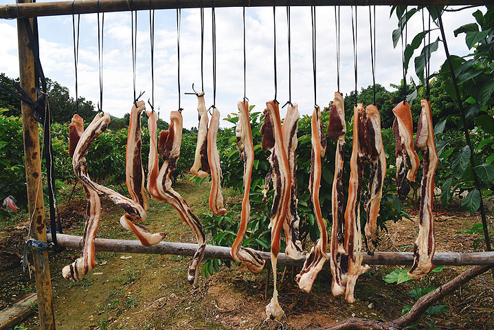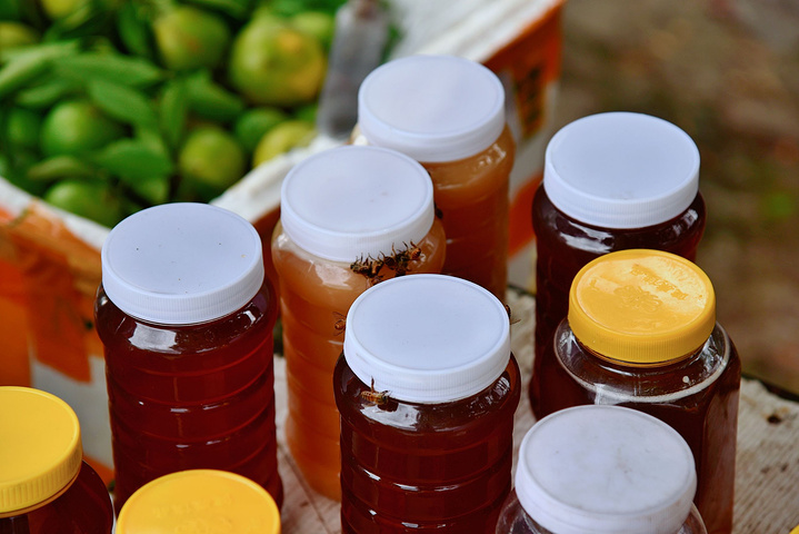 水库旁有挺多农家摆的摊,都是卖当地的土特产。风干的腊肉、现摘的番石榴……蜂蜜罐旁还有好多小蜜蜂在飞。