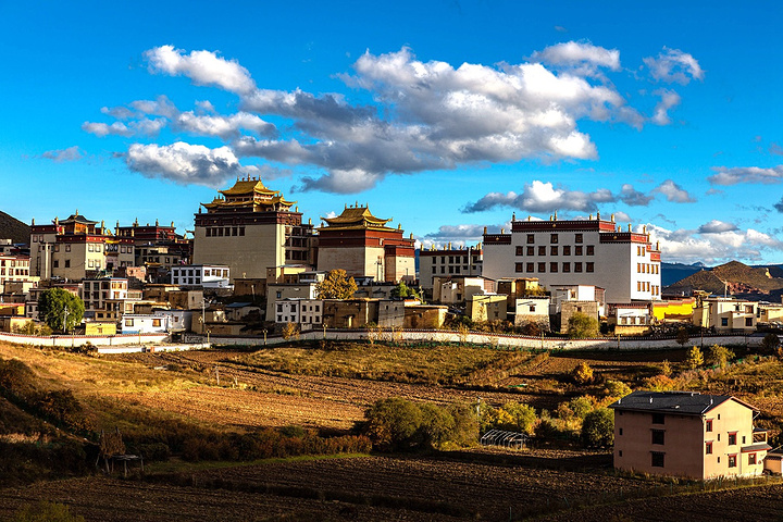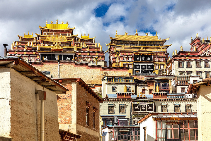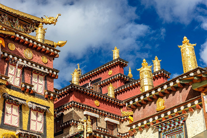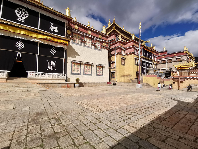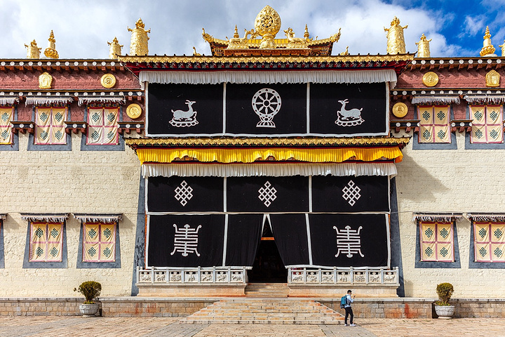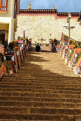 时间尚早,稍事休息后前往松赞林寺游览,林卡住客有松赞林寺赠票,可以走一条小路到松赞林寺,大概15分钟即到,我们是开车直接到寺庙内的高处下车,然后一路往下走到寺庙大门口,司机在停车场接,避免了高原爬坡之辛苦。 松赞林寺主要有三个大殿和八大康参组成。
