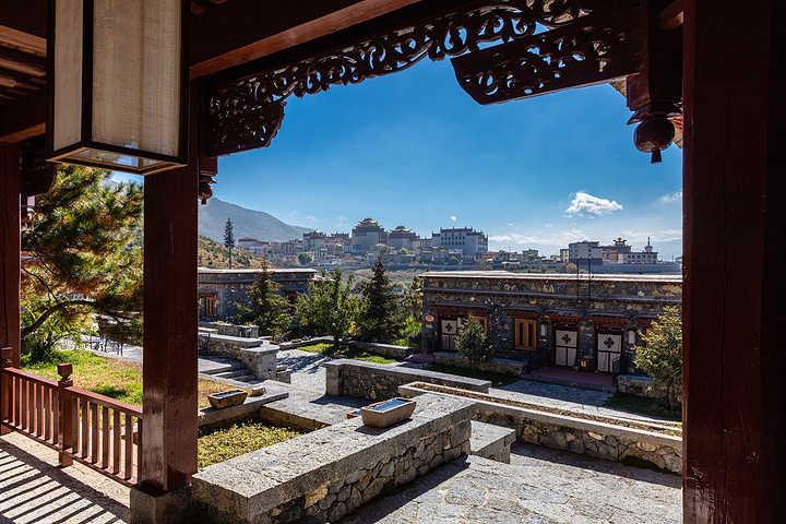 去松赞林卡入住,下车后还是哈达送上,办理入住手续时还有热毛巾,姜茶和小点心迎候。 香格里拉松赞林卡酒店位于建塘镇松赞林寺小街子村,建筑群坐北向南,每一个房间向南望去,几乎都能看到近400年历史的松赞林寺。