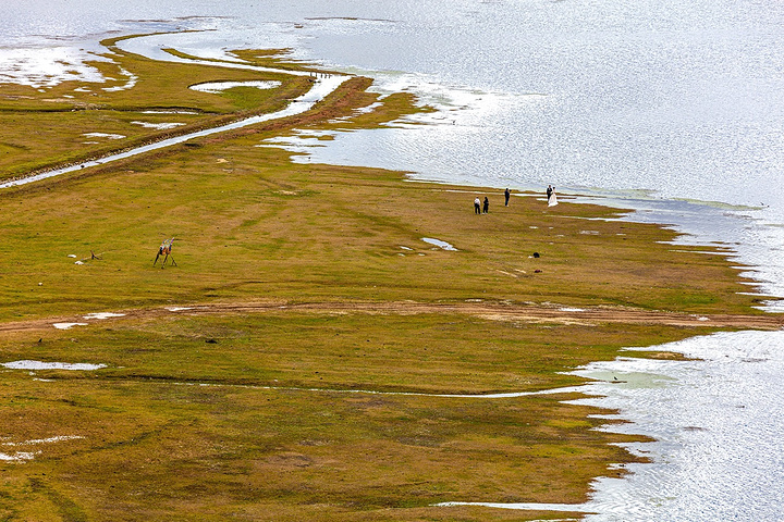 水草丰美,牛马在湿地上觅食,晒谷架点缀在纳帕海旁。