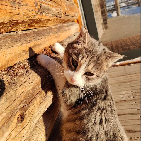 民宿里偷偷跑出来晒太阳的猫咪。喀纳斯老村。冻jio的猫咪也丝毫不畏惧生人,会爬到人身上取暖。森林与溪流静默,木制的小木屋飘散着袅袅炊烟,三三两两的猫咪和小狗穿梭在雪地上,牧民马拉爬犁的铃铛声格外清脆,多美好啊。来自游记我无时不刻想念冬日的喀纳斯,还有那些“特别”的朋友