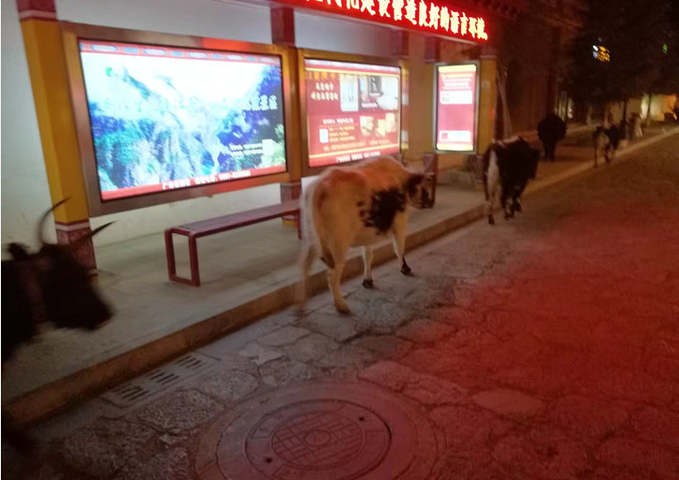 吃完火锅返回住处,路遇才回家的hao牛群,悠闲地在大街上逛着,不紧不慢往回走。想说这边民风实在太好了。