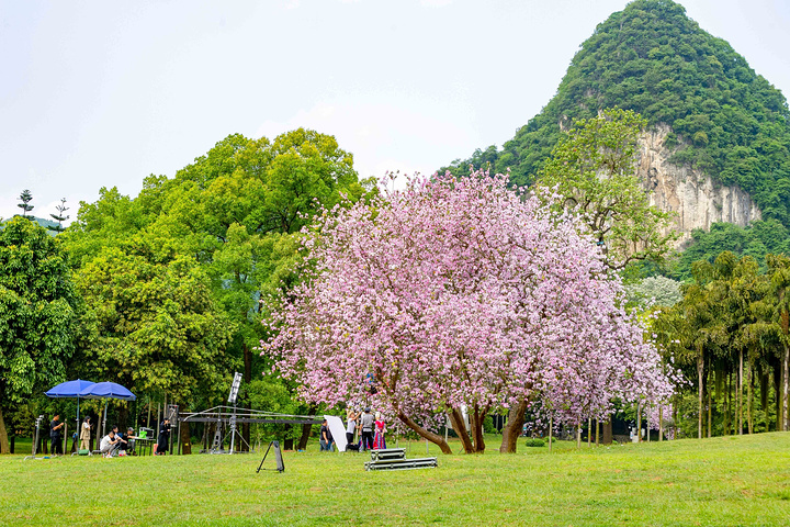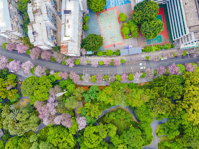 提起柳州的紫荆花,本地人最先想起的是弯塘路。这里从上个世纪便开始种植紫荆,可以说是当地人心中的“紫荆路”了。而且,“S”型弯塘路本身也很有特色,从高处看弯塘路,路上的紫荆花也变成粉色的花海曲线,超级浪漫。