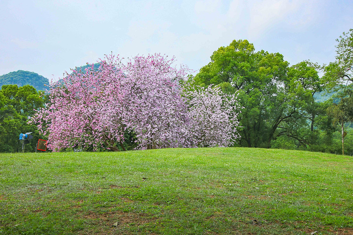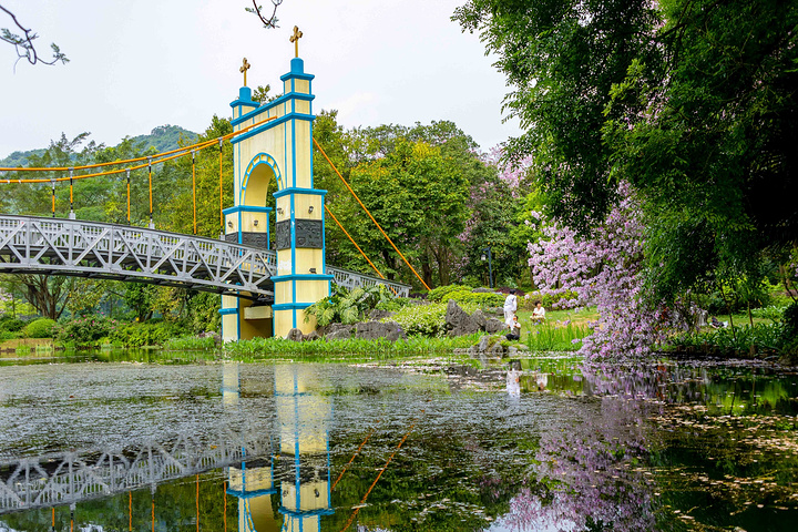 公园广场上到处花卉飘香,山谷里棕榈婆娑。主干道高大林木遮天蔽日,道路两旁绿草如茵,鱼尾葵、假槟榔等亚热带植物生长茂盛,游泳池,5D影院和别致的傣式建筑散落其间 。一到春天,公园中的紫荆花盛开,粉紫色的紫荆花林与风雨桥相互映照,格外好看。